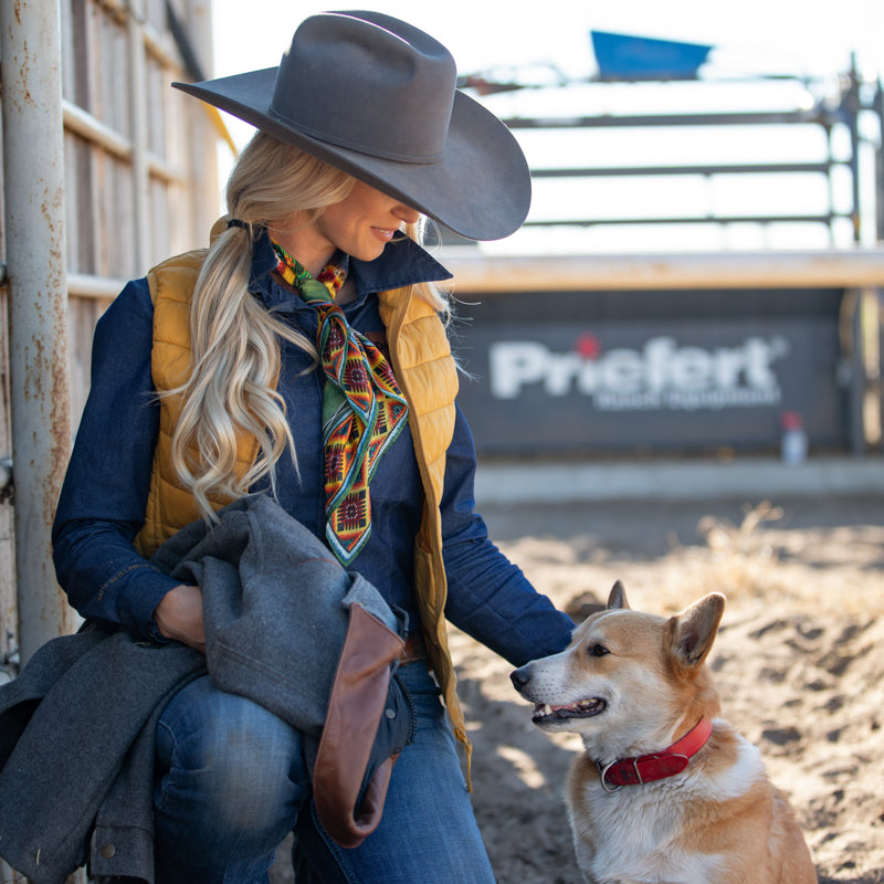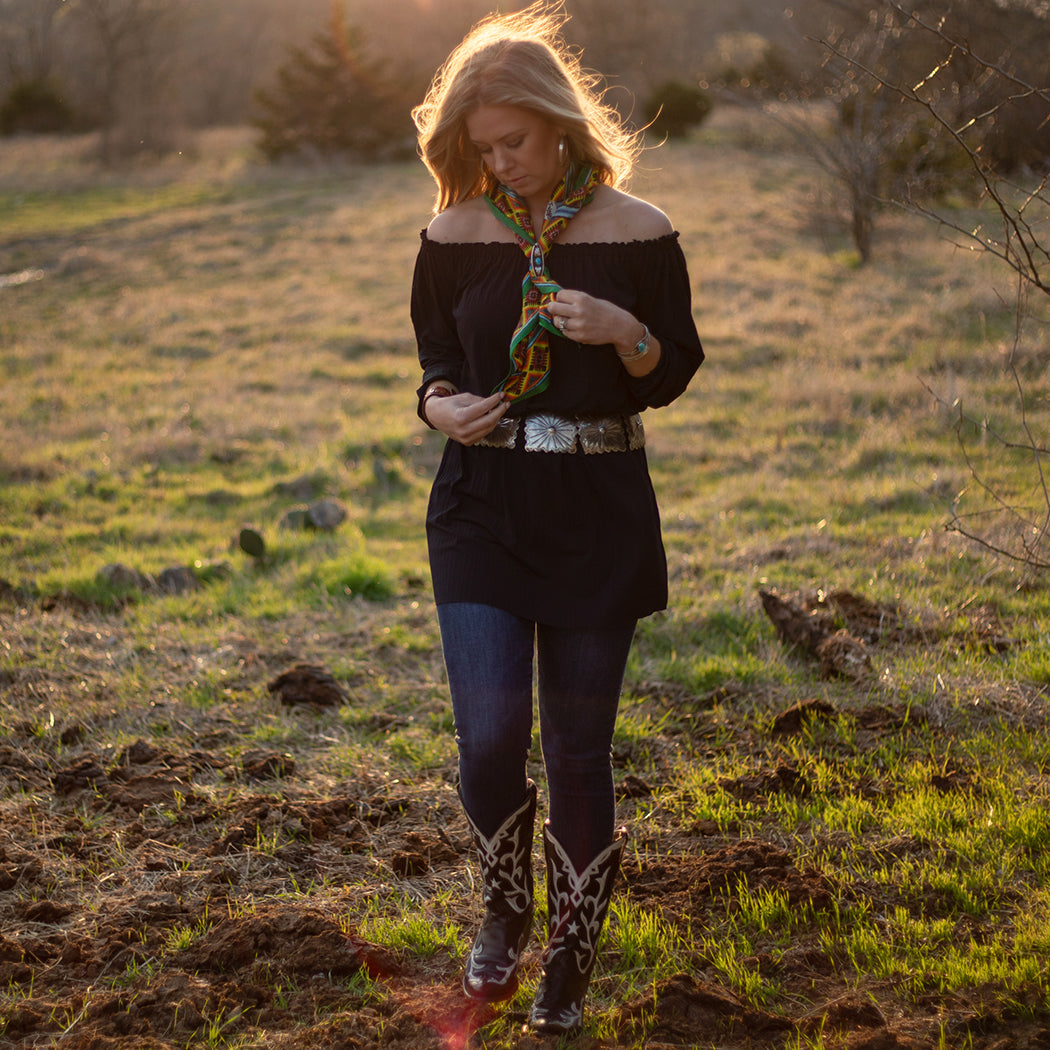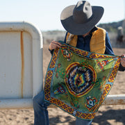 Skulls, thunderbirds and buffalo are placed throughout, with an Aztec border to finish off the edges. Bright colors muted with just a touch of antiquing, this scarf can be worked into any color scheme!