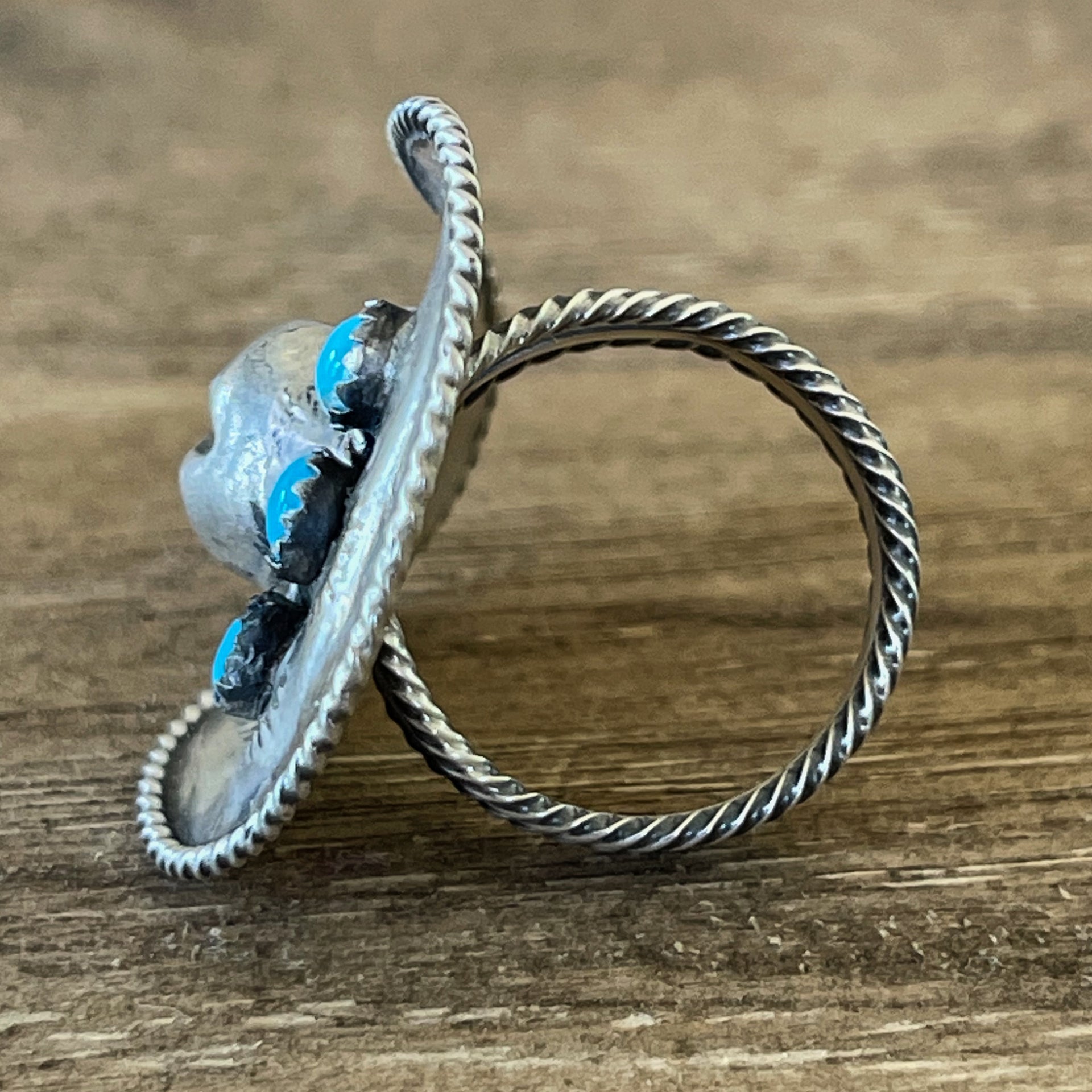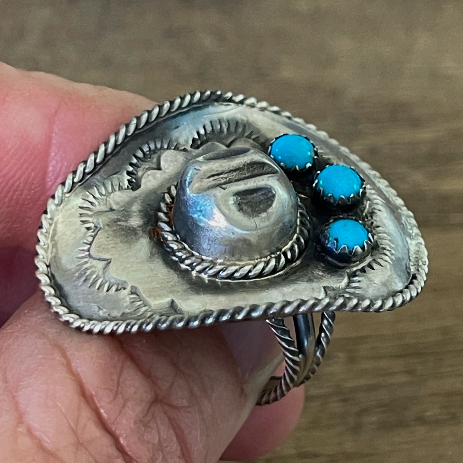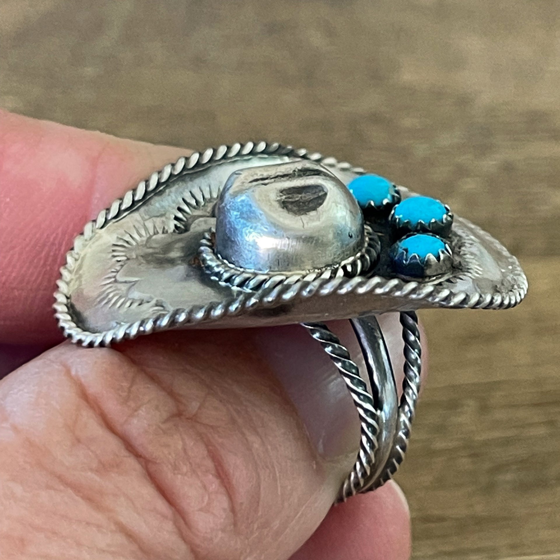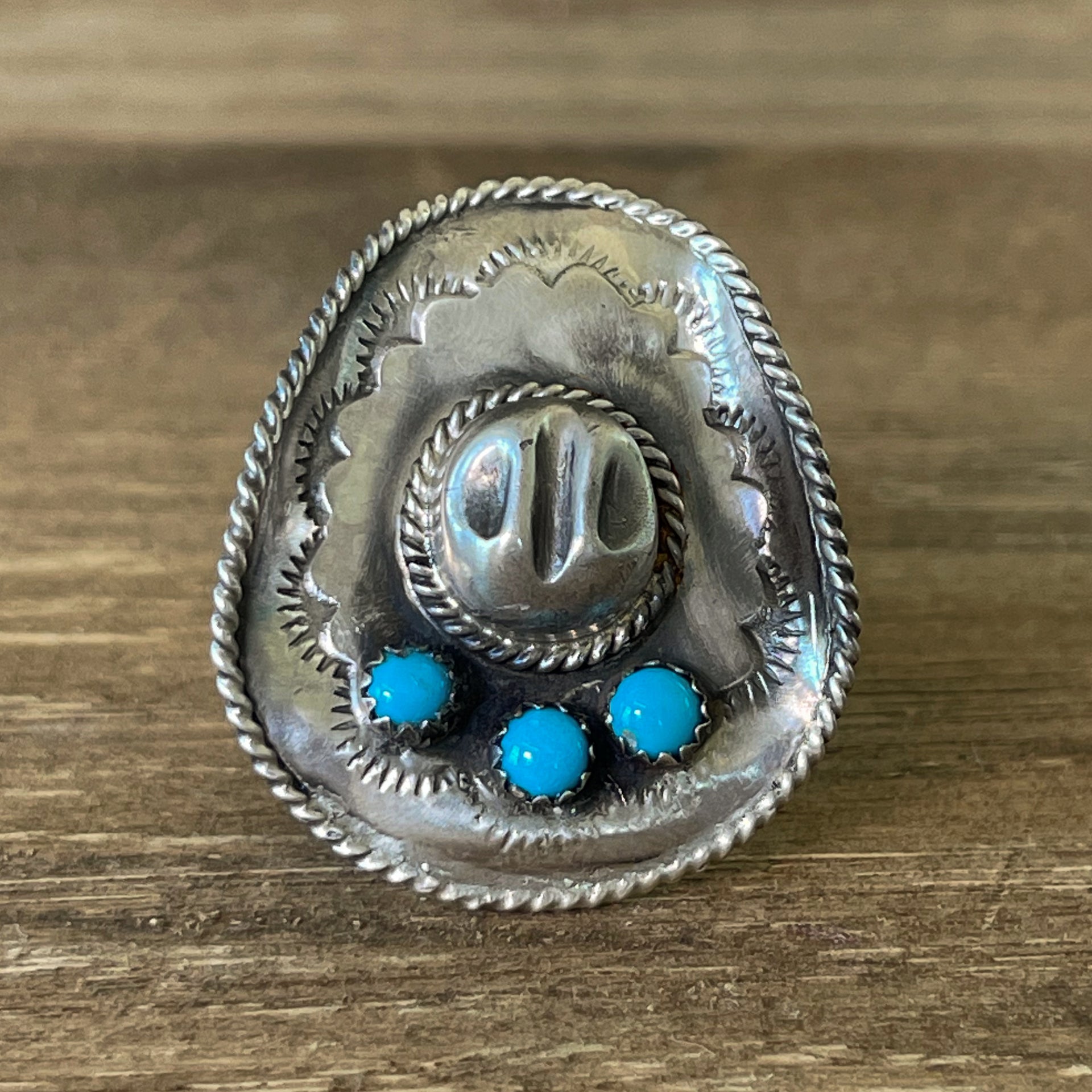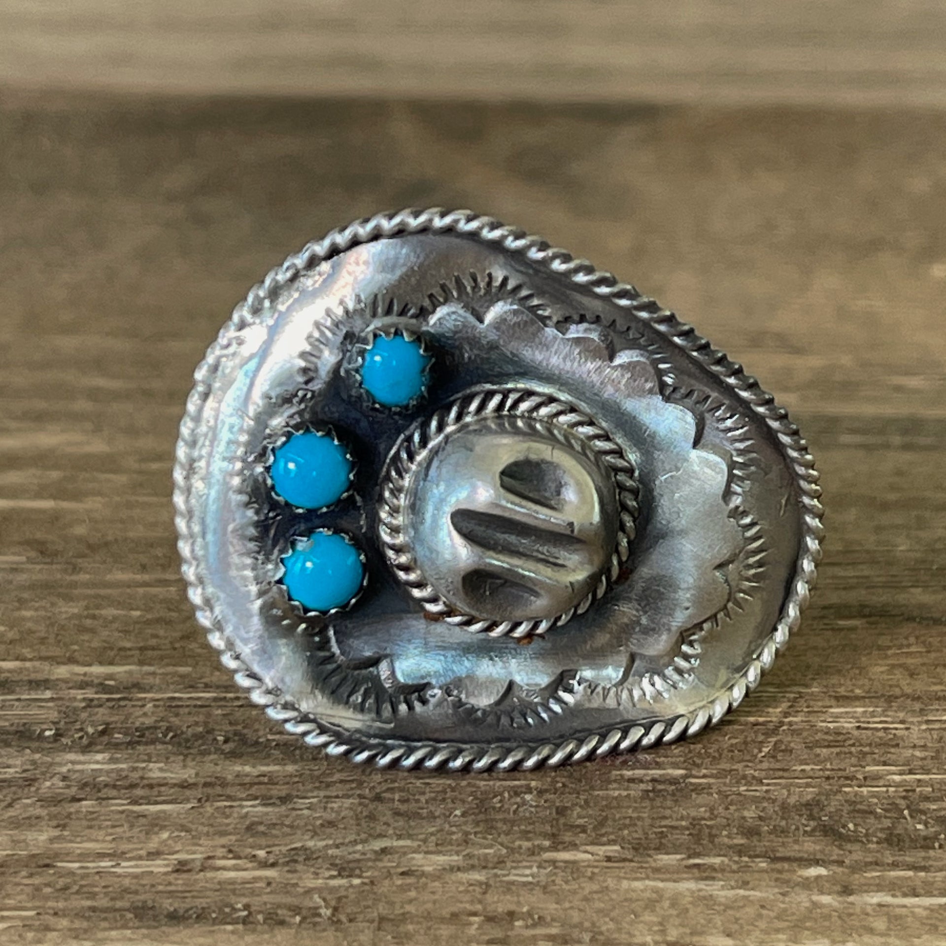 This beautiful Cowboy Hat slide is sterling silver plated with 3 small turquoise stones. This is a lightweight slide that won't weigh down your wild rag. Great southwest look!