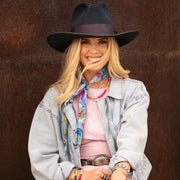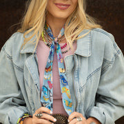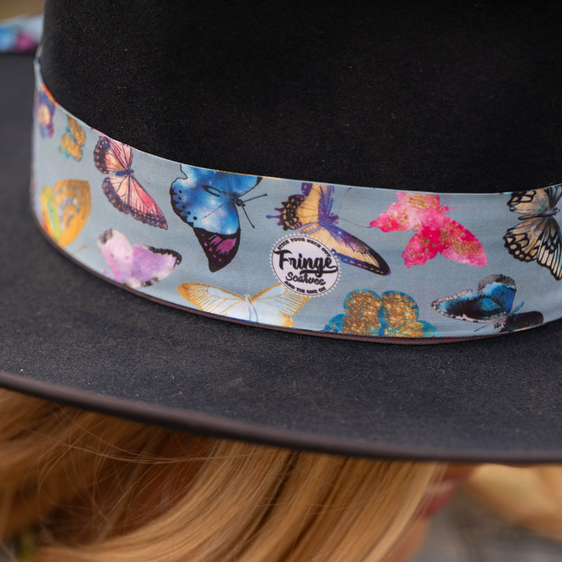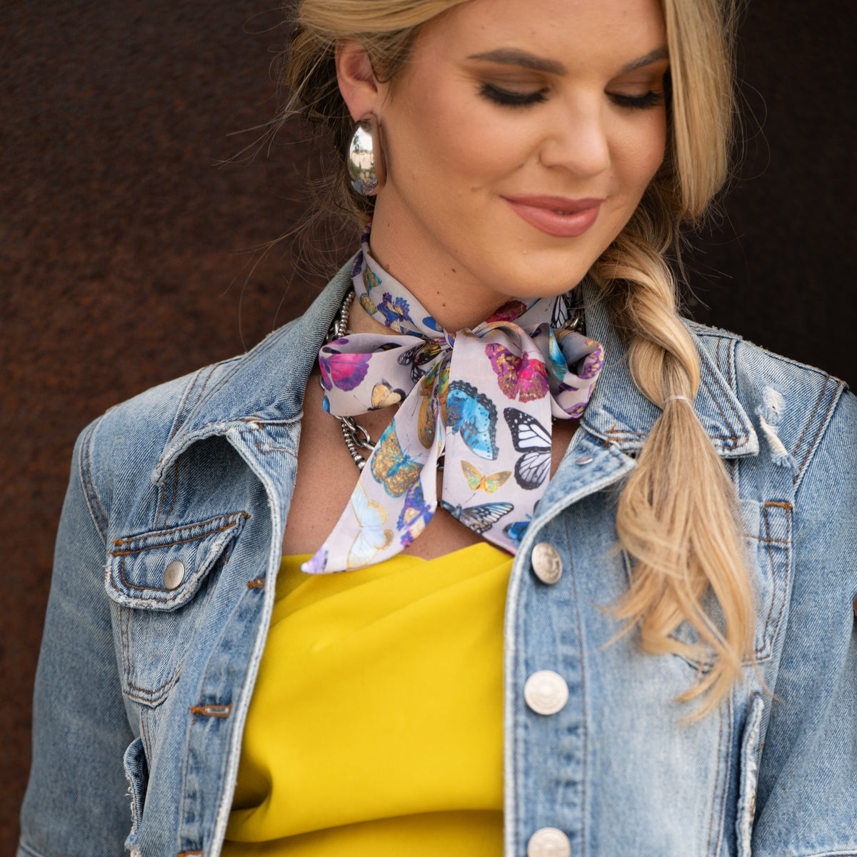 The Butterfly Twilly is a symbol of transformation and freedom—its vibrant hues and chambray backdrop bring a bold, effortless charm to everything from denim to dress coats.