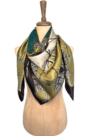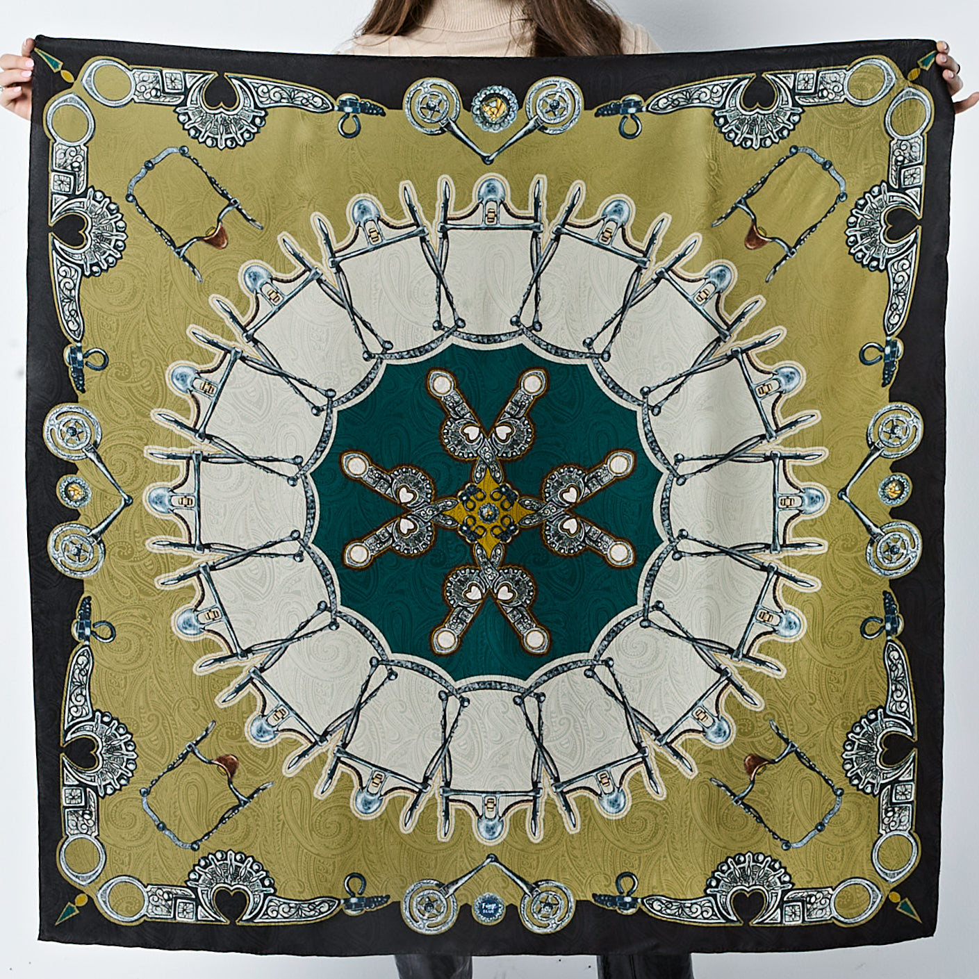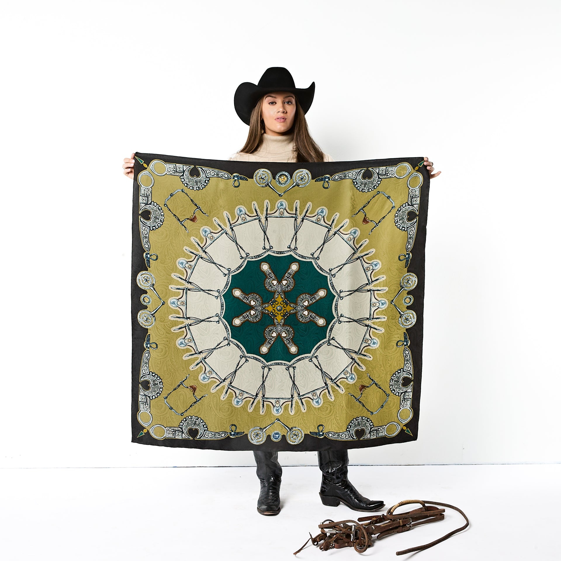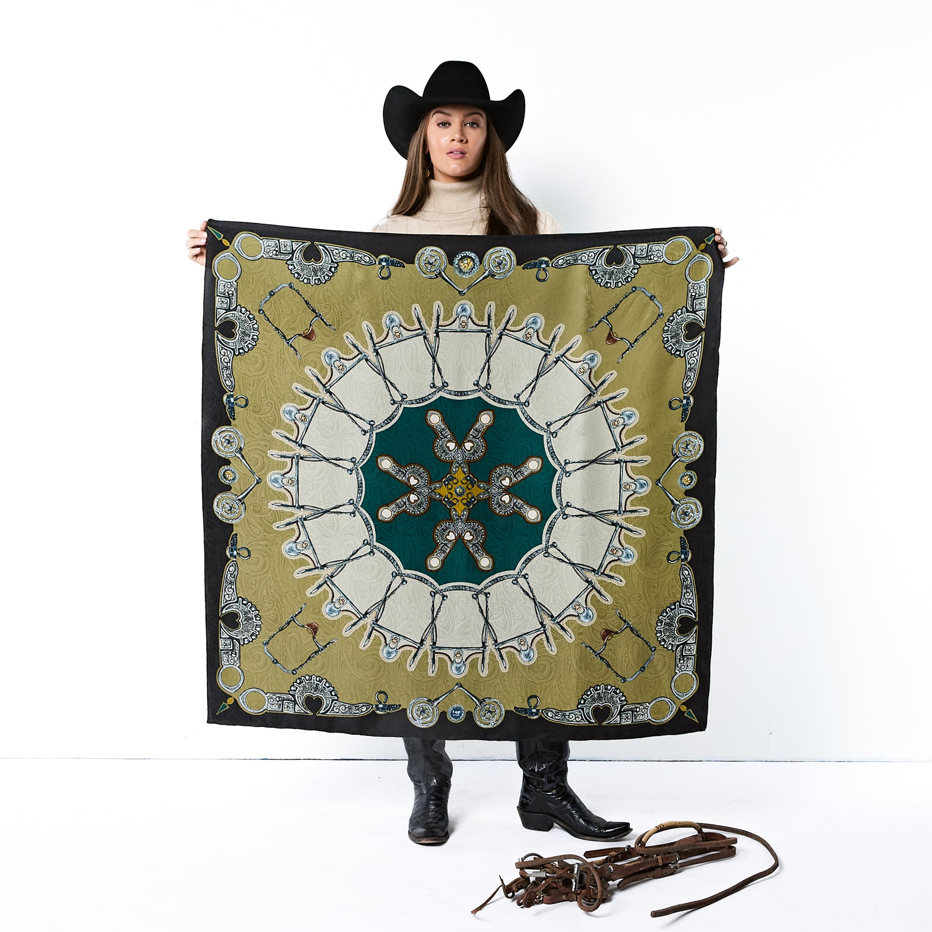 The Bits scarf is an artful study in symmetry and craftsmanship, featuring a striking radial design inspired by the refined forms of classic horse bits. Each snaffle and shank interlocks in a graceful rhythm that evokes both precision and motion. A nod to the artistry of fine tack-making, Bits celebrates the balance of control and elegance - where craftsmanship meets command. Much like the bit itself, this scarf takes the lead, adding confidence and sophistication to any look. Designed for those who know when to hold the reins and when to let style run free.