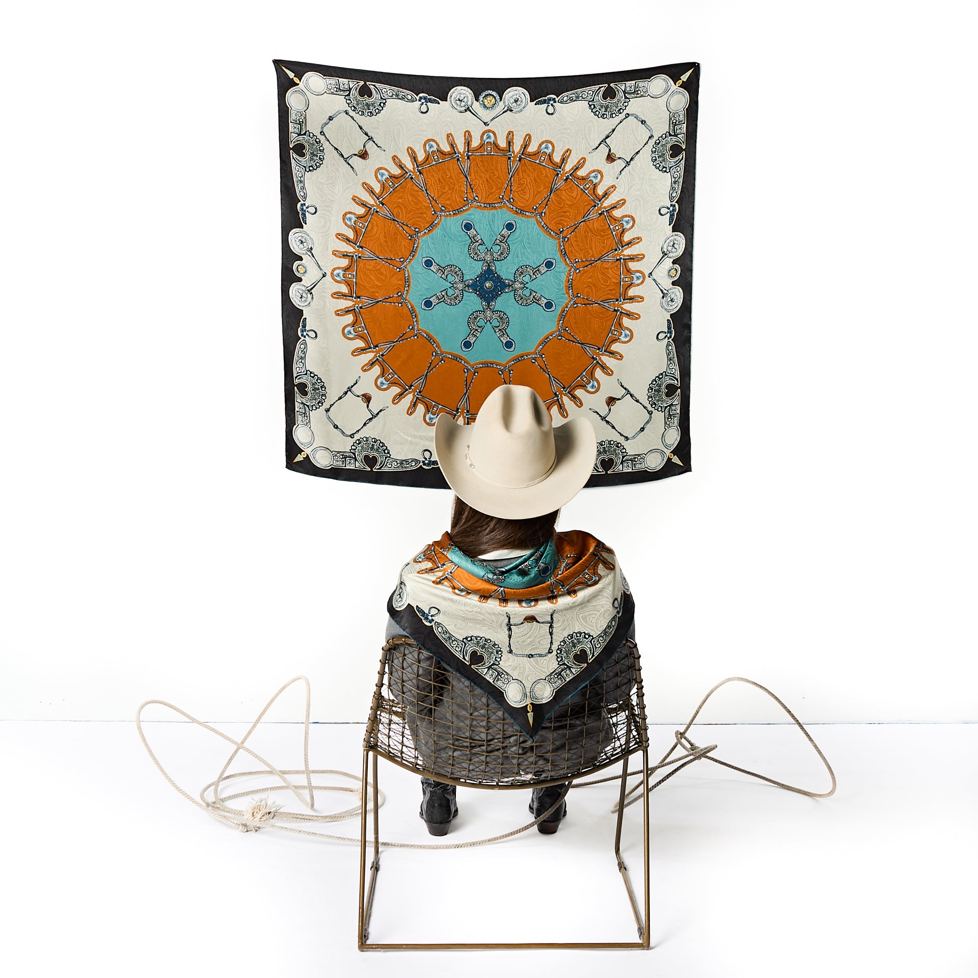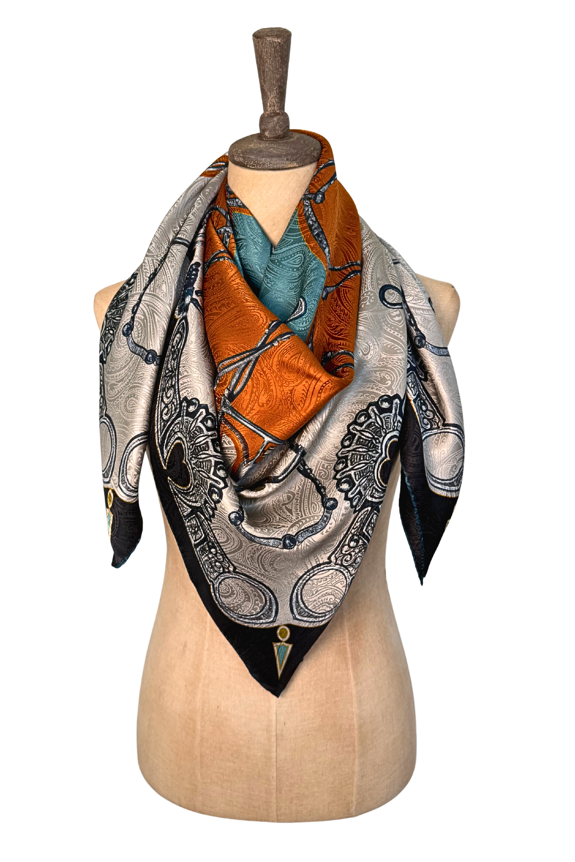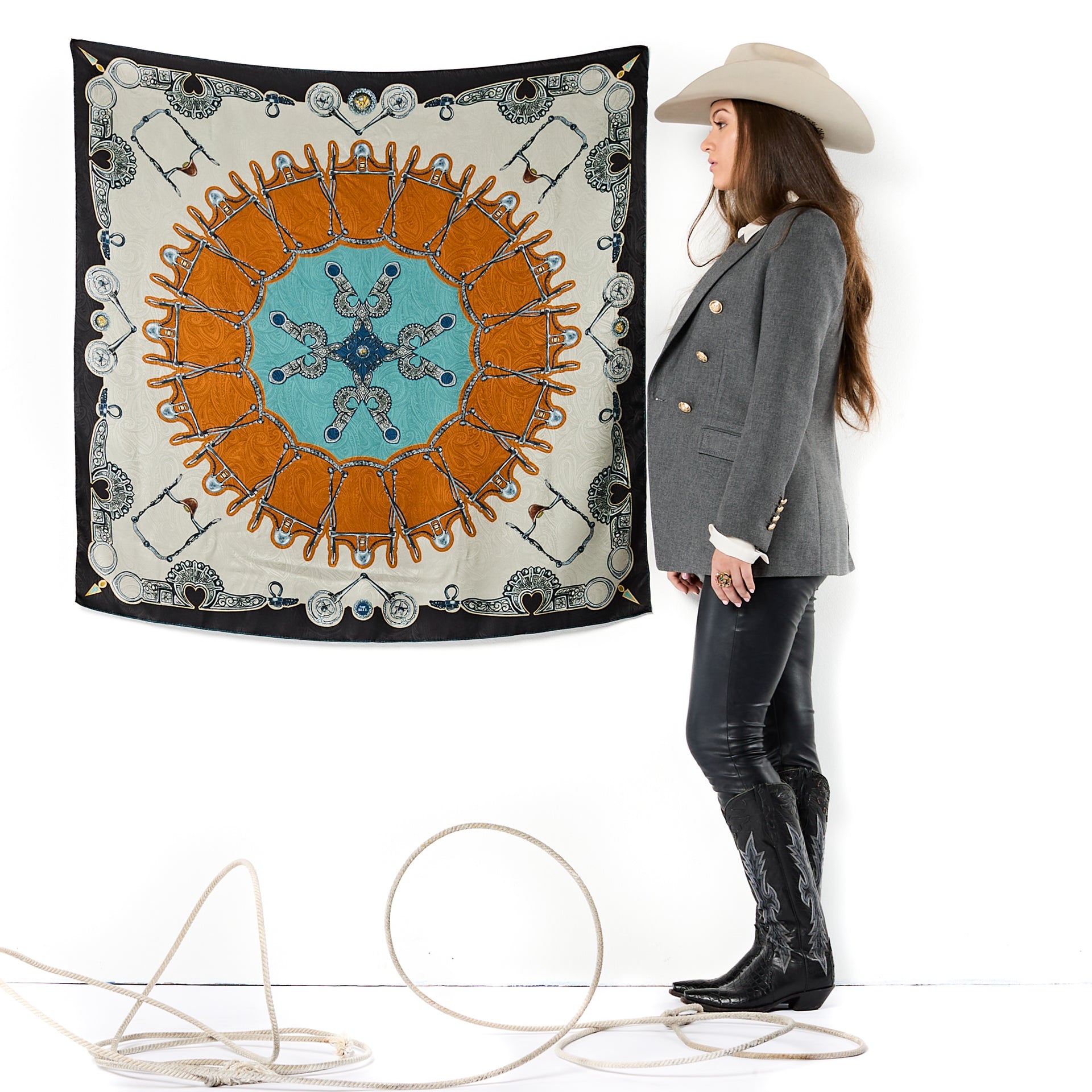 The Bits scarf is an artful study in symmetry and craftsmanship, featuring a striking radial design inspired by the refined forms of classic horse bits. Each snaffle and shank interlocks in a graceful rhythm that evokes both precision and motion. A nod to the artistry of fine tack-making, Bits celebrates the balance of control and elegance - where craftsmanship meets command. Much like the bit itself, this scarf takes the lead, adding confidence and sophistication to any look. Designed for those who know when to hold the reins and when to let style run free.
