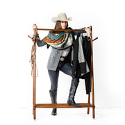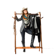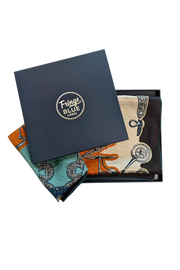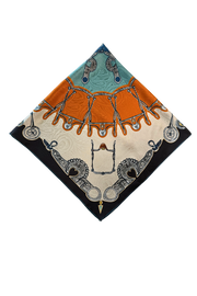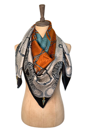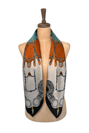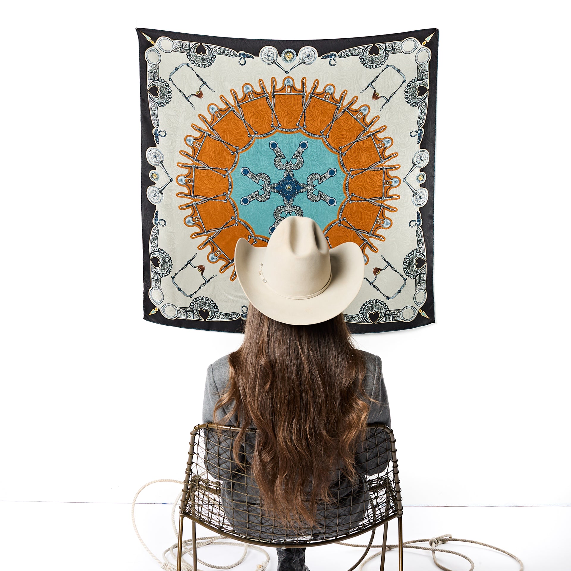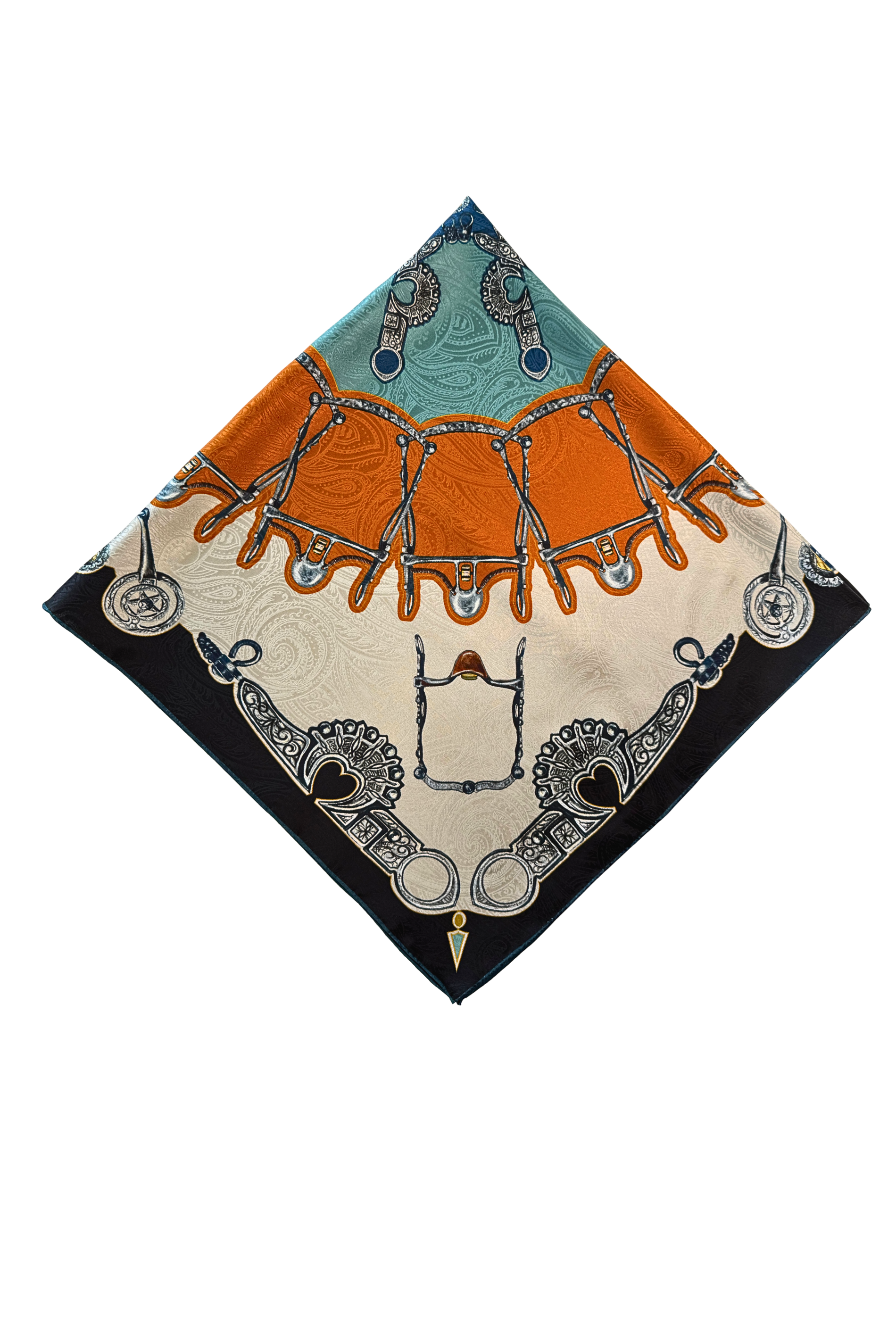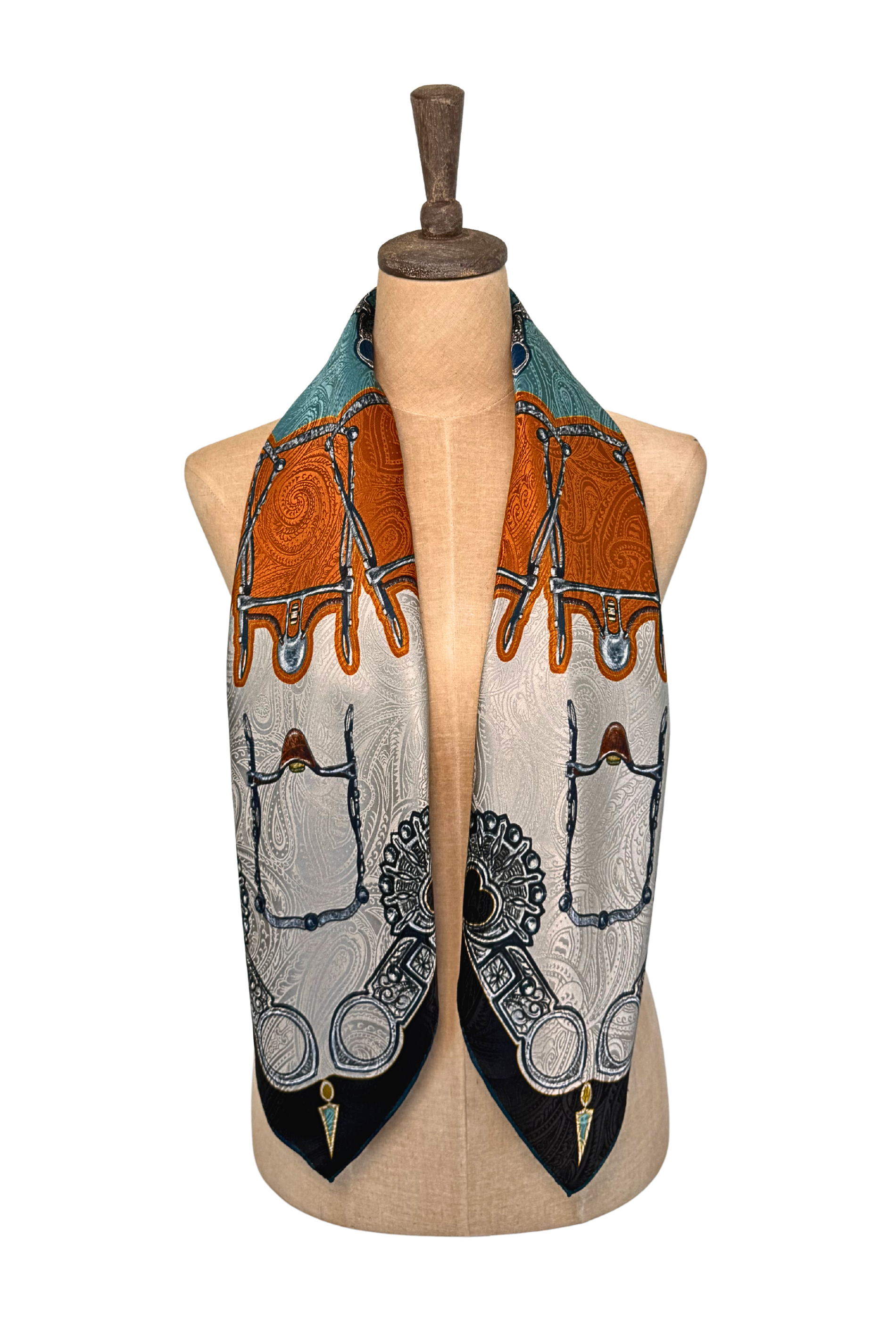 The Bits scarf is an artful study in symmetry and craftsmanship, featuring a striking radial design inspired by the refined forms of classic horse bits. Each snaffle and shank interlocks in a graceful rhythm that evokes both precision and motion. A nod to the artistry of fine tack-making, Bits celebrates the balance of control and elegance - where craftsmanship meets command. Much like the bit itself, this scarf takes the lead, adding confidence and sophistication to any look. Designed for those who know when to hold the reins and when to let style run free.