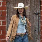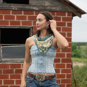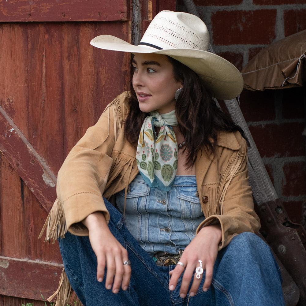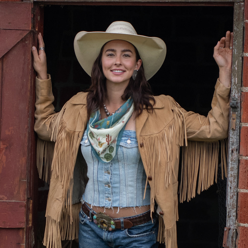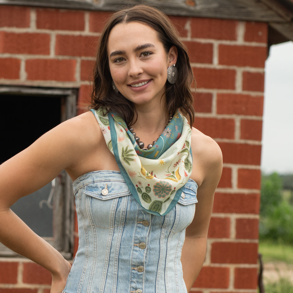 We searched high and low to find the perfect bandana fabric! A blend of mostly cotton, but enough silk to keep it sheer and lightweight. Our bandanas are super-duper soft and ready to wear straight from the packaging! The standard cotton bandana is 22"x22", we made ours a few more inches longer to have that extra room to tie with or to add a scarf slide.