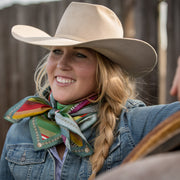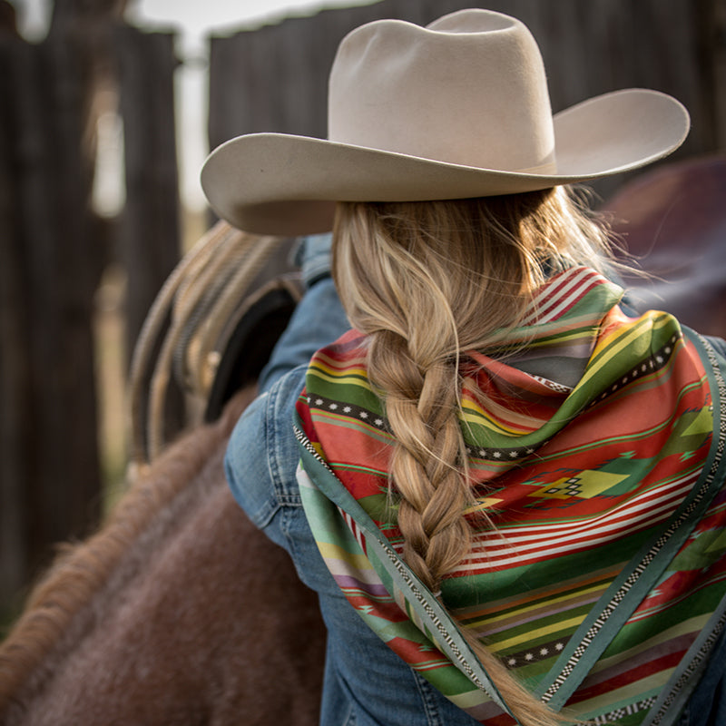 Corals are big this summer and well represented in the Down South Serape, along with lighter blues, greens and lavenders. The lighter colors are offset with bolder purples, jades, golds and silvers. Black and white aztec border and silver concho tips add some finish to our take on the serape.