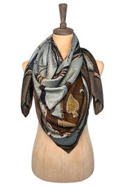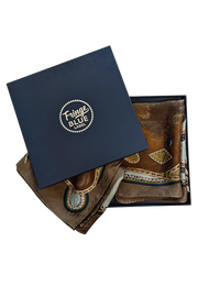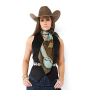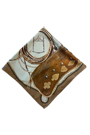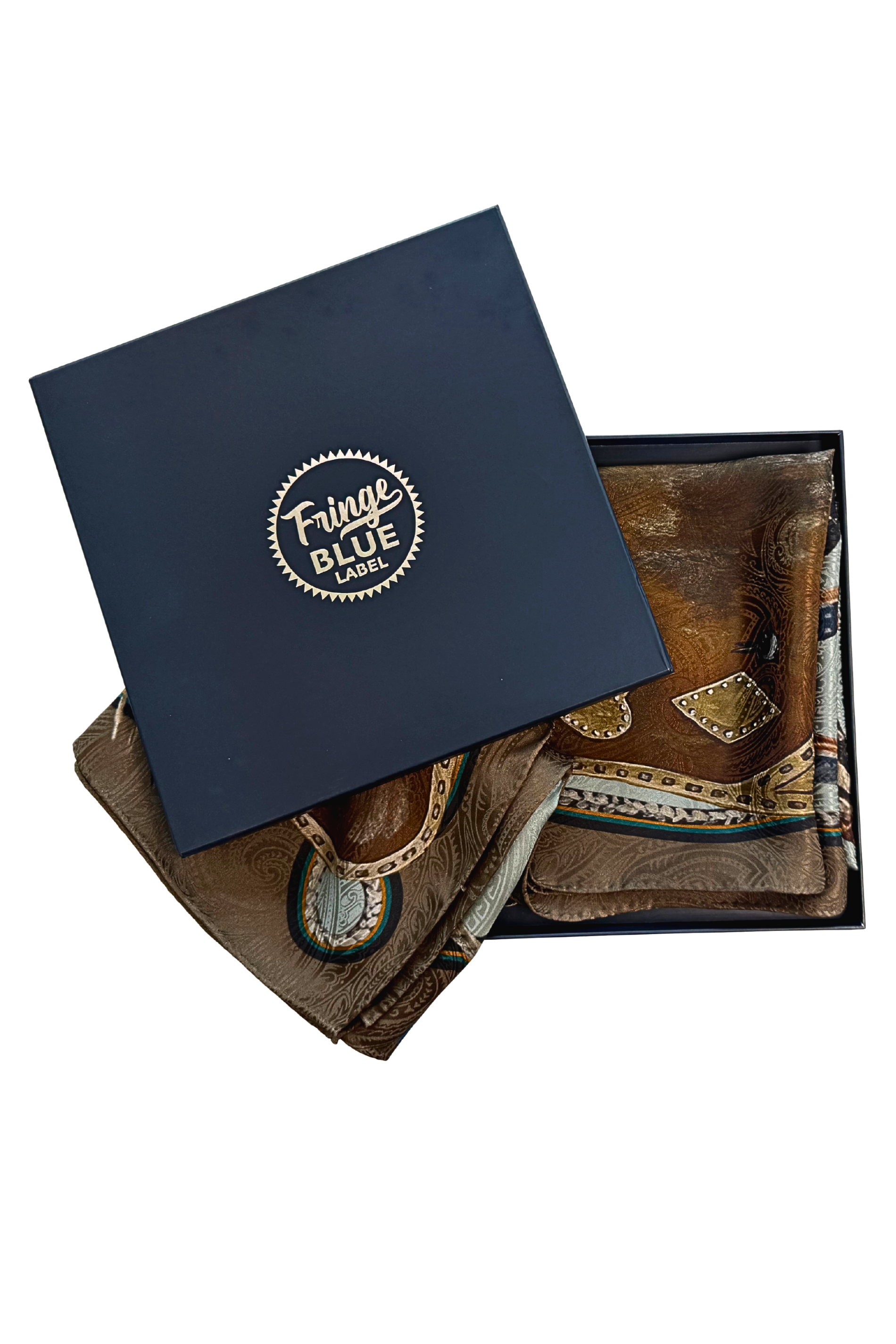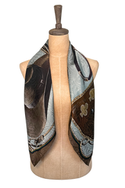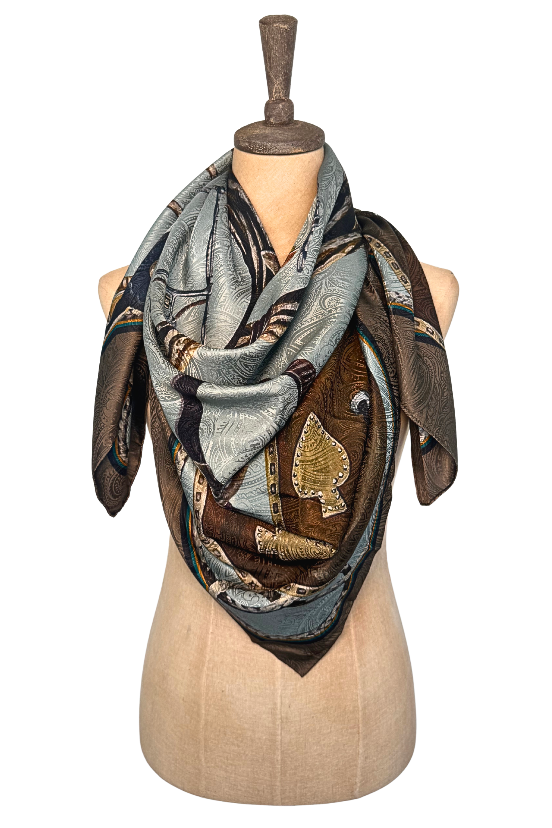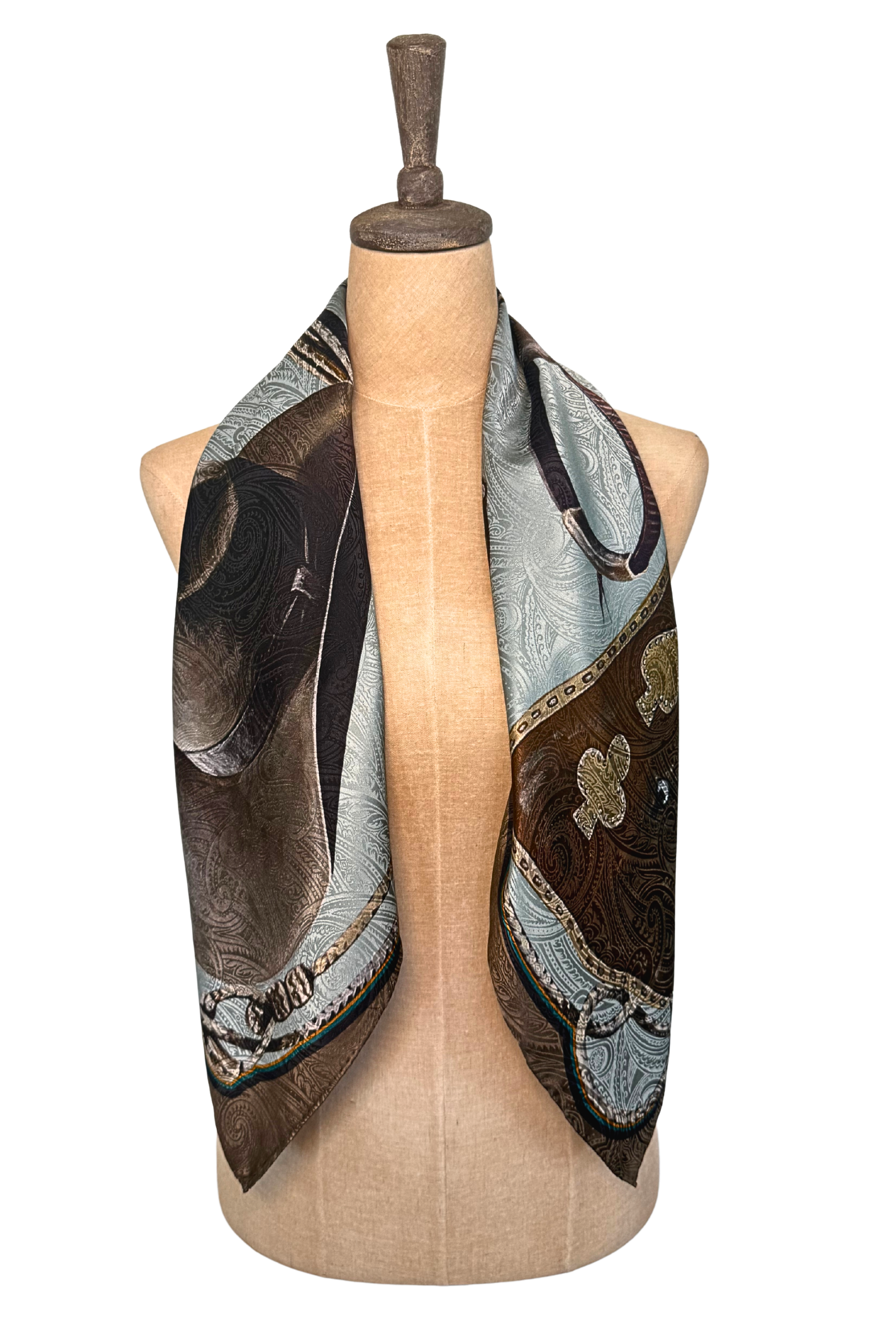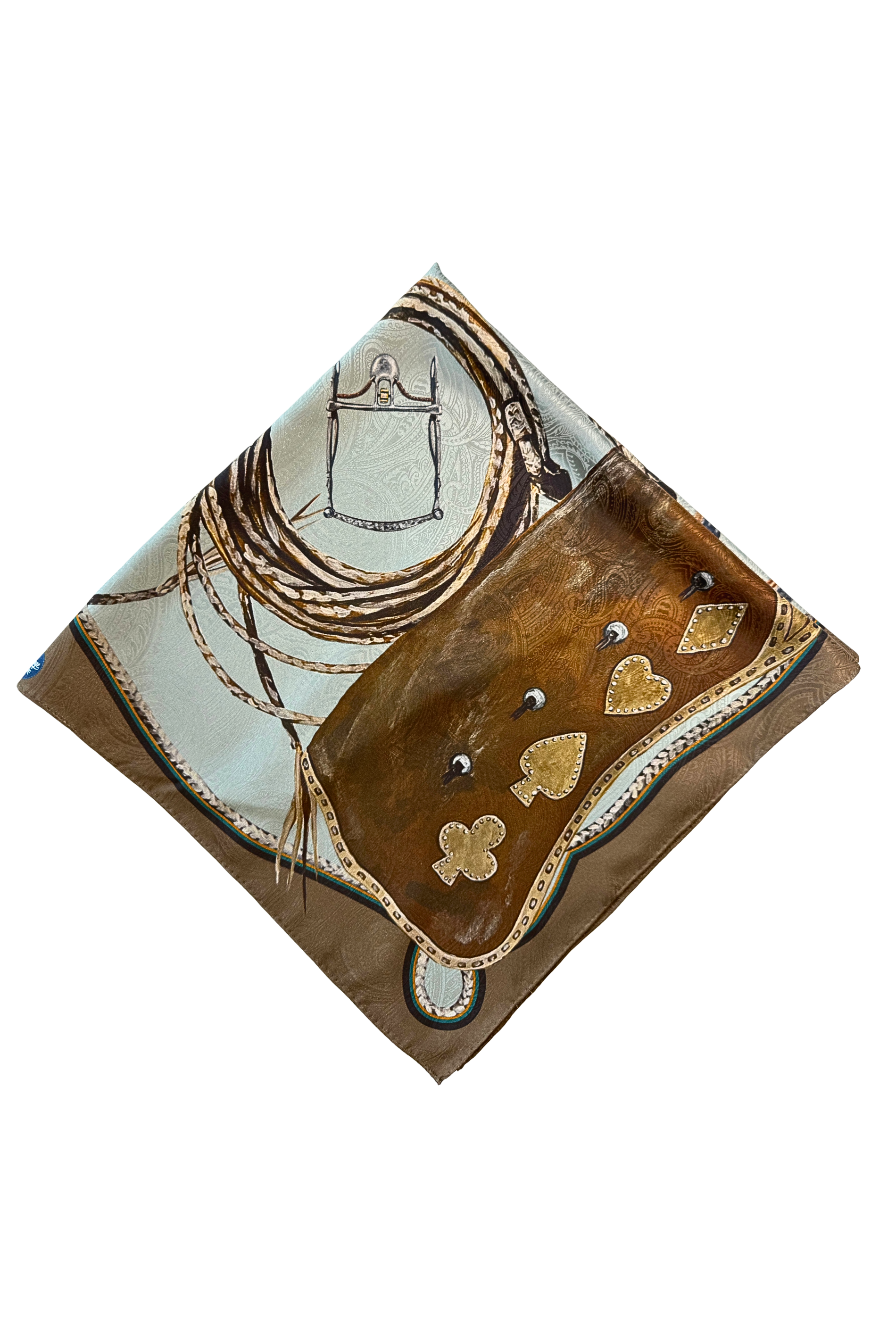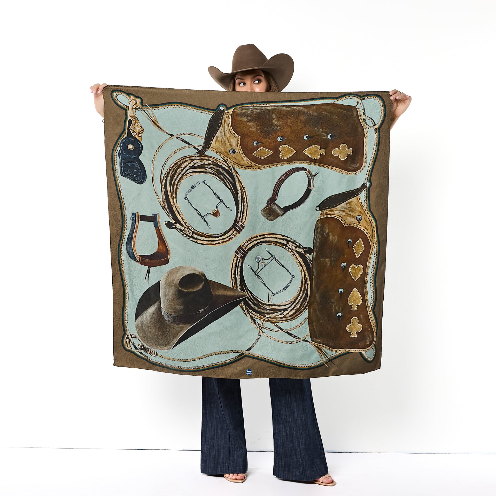 The Gettin’ Western scarf is a tribute to the grit, heritage, and quiet refinement of the working West. Its design captures the essentials of a cowboy’s world - chaps, bits, ropes, and a well-worn hat - each rendered with a reverence for the craftsmanship and purpose behind them. What was built for utility now becomes art, arranged with balance and intention on fine silk. Gettin’ Western embodies the spirit of those who earn their elegance through hard work - where tradition meets timeless style, and every detail tells the story of a life shaped by the land.