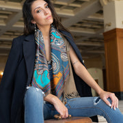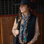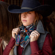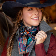 This scarf showcases a traditional paisley center with some great colors for an extra punch! Geometric border of plum and taupe at edge for an easy match when it comes to your felt hat or suede jackets.... from pecan, natural or buckskin.
