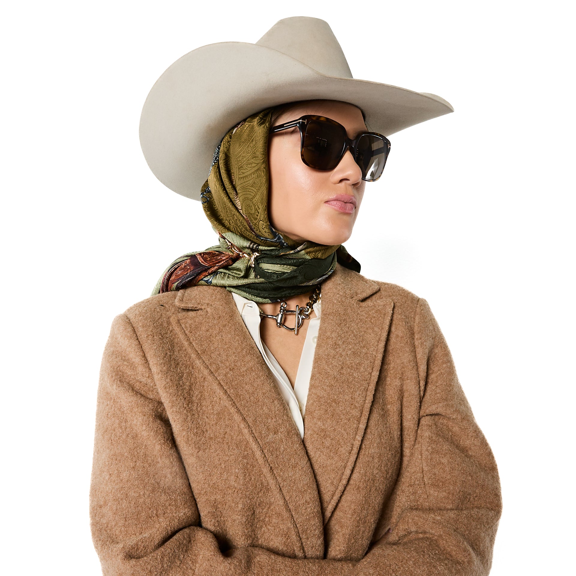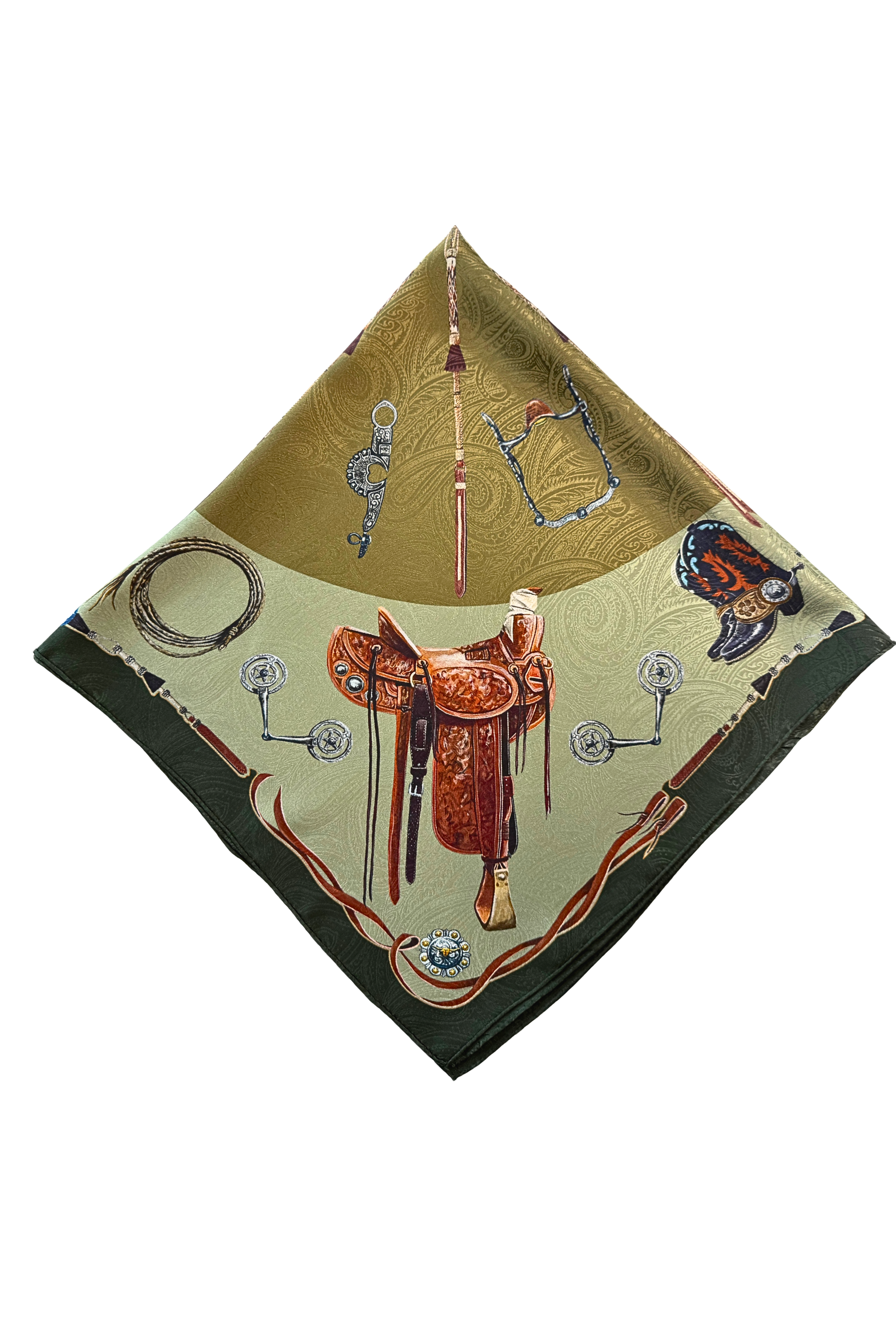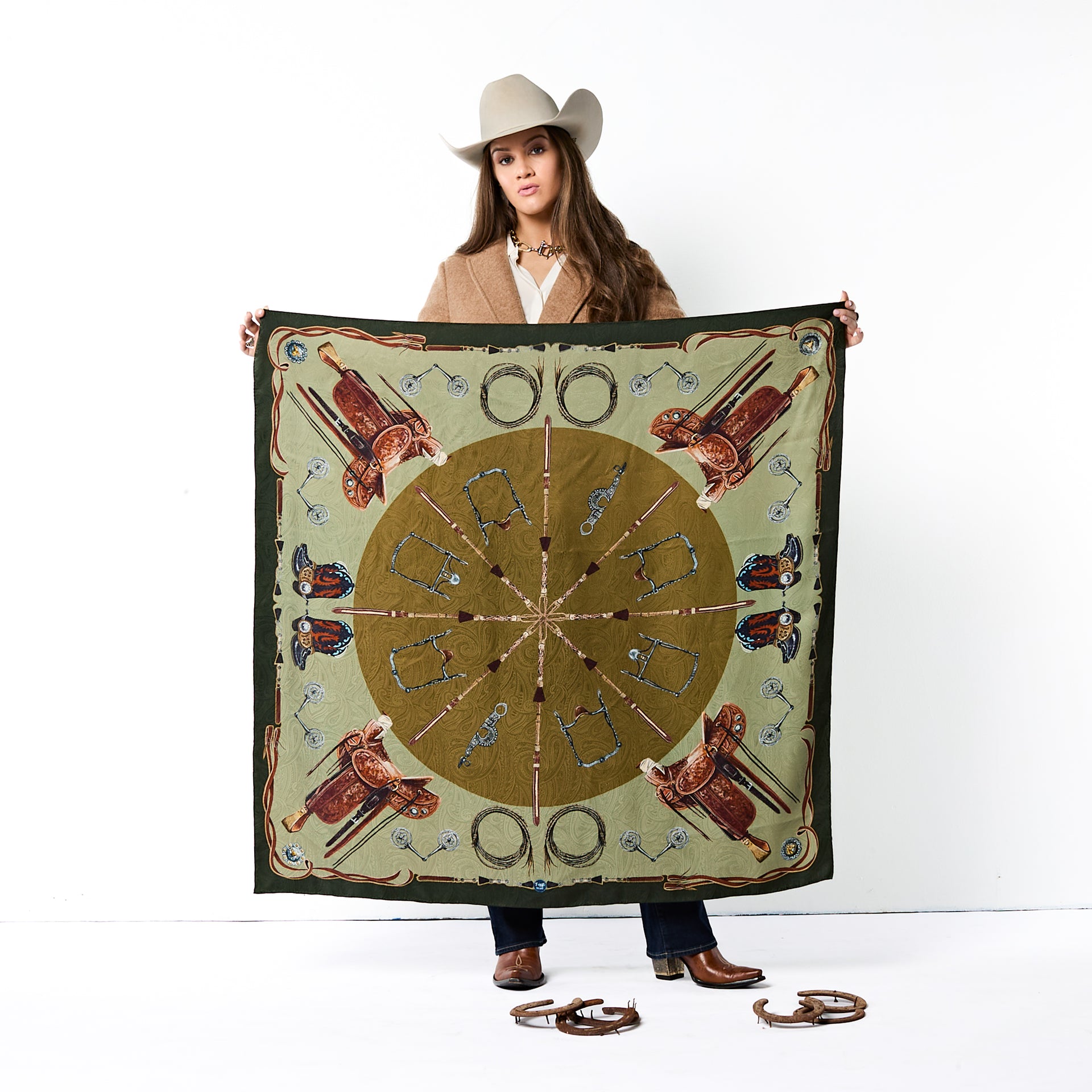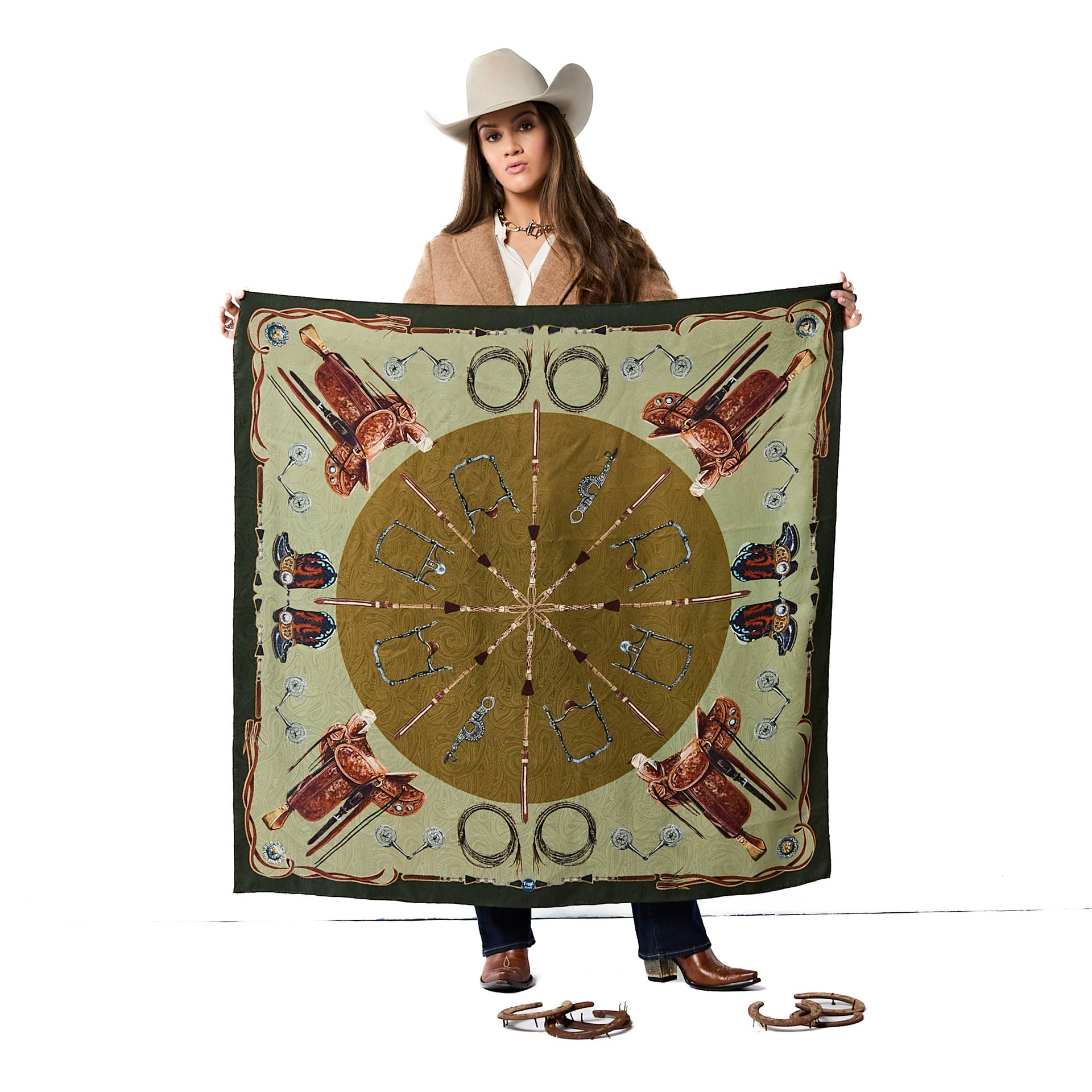 The Ranch Gear scarf is a celebration of the tools that shape life on the range - each piece telling a story of craftsmanship, discipline, and devotion to the work. Saddles, bits, ropes, and spurs form a bold, circular composition that feels both grounded and refined, much like the people who use them. Every detail honors the artistry of the ranch - where beauty is born from purpose and mastery is earned through use. Ranch Gear turns the everyday into the extraordinary, capturing the essence of Western tradition with effortless sophistication.