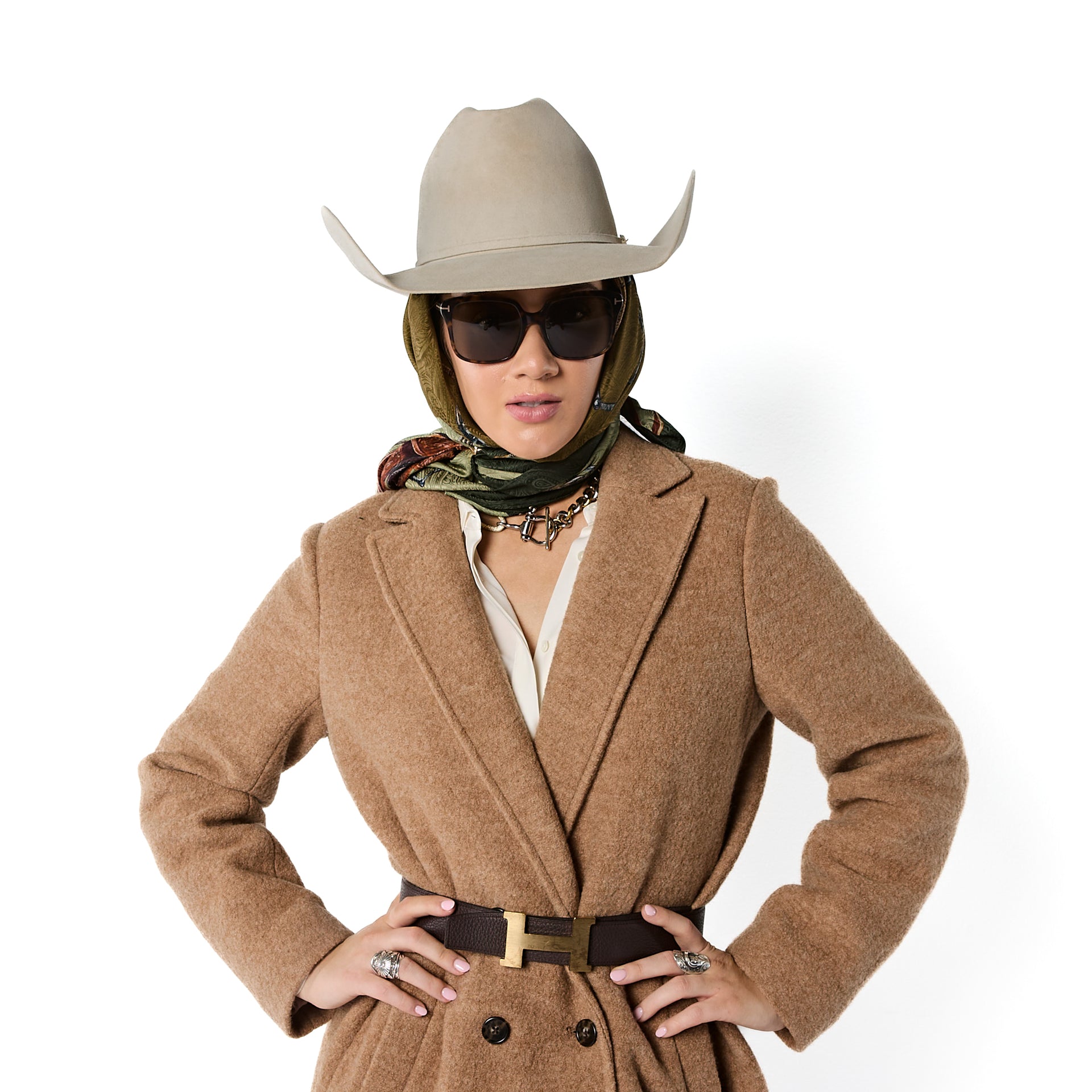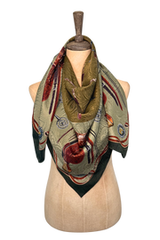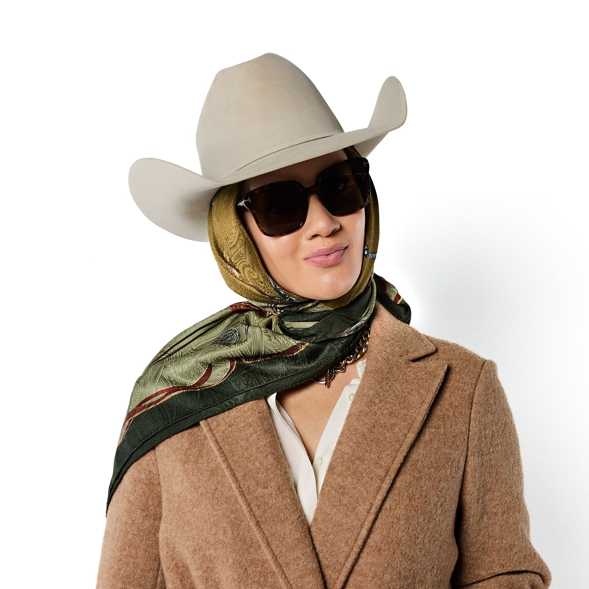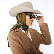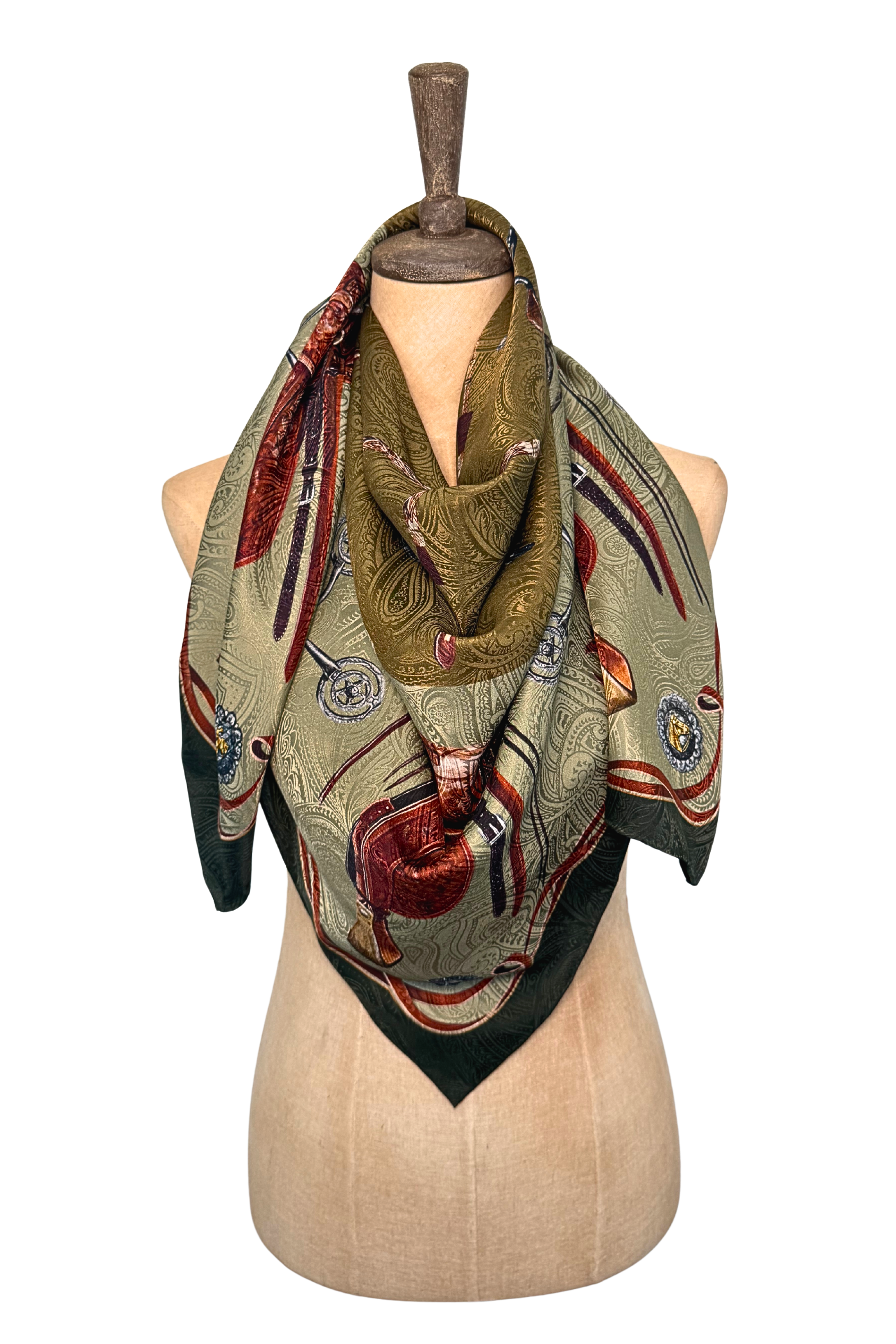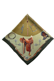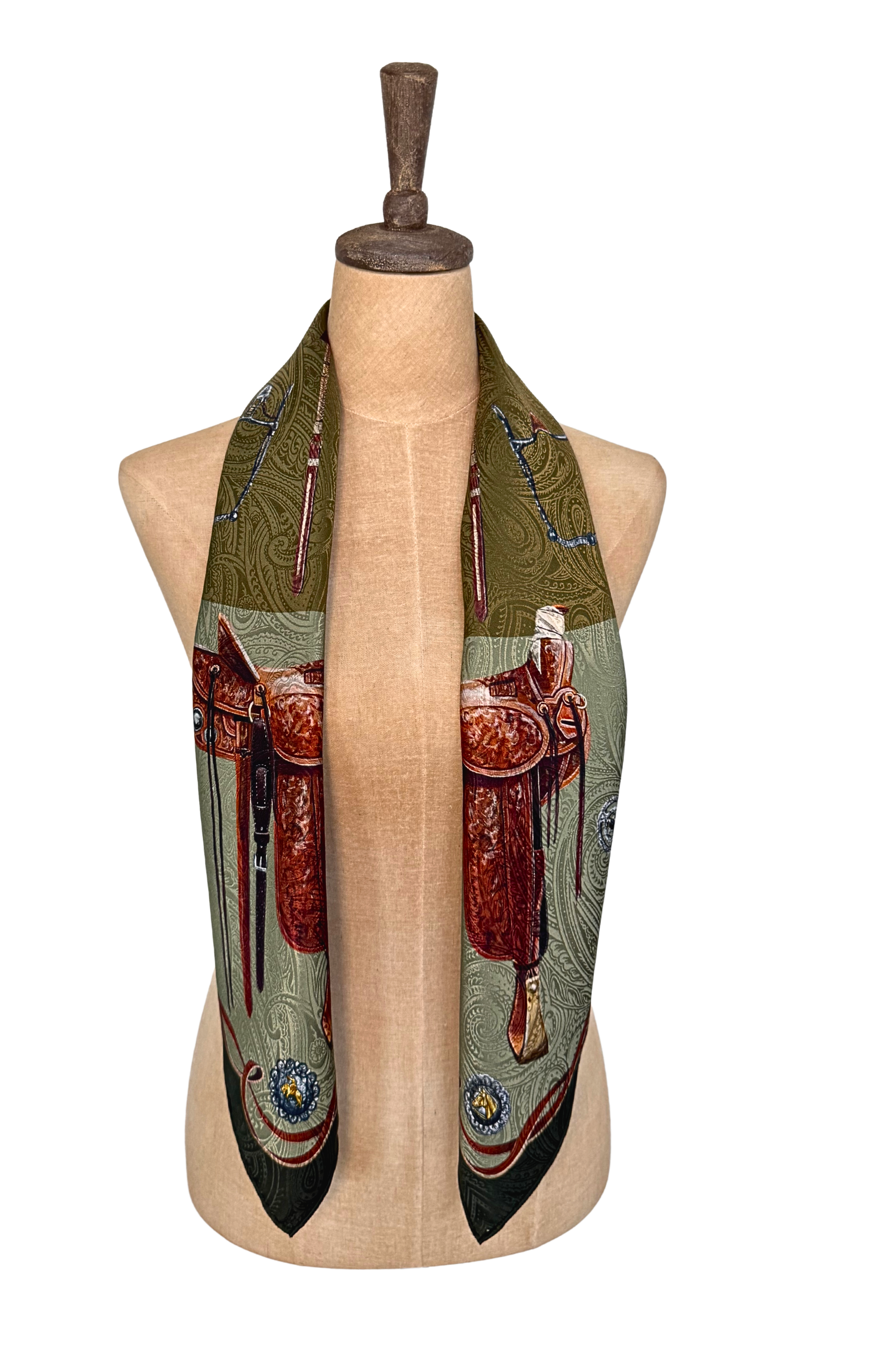 The Ranch Gear scarf is a celebration of the tools that shape life on the range - each piece telling a story of craftsmanship, discipline, and devotion to the work. Saddles, bits, ropes, and spurs form a bold, circular composition that feels both grounded and refined, much like the people who use them. Every detail honors the artistry of the ranch - where beauty is born from purpose and mastery is earned through use. Ranch Gear turns the everyday into the extraordinary, capturing the essence of Western tradition with effortless sophistication.