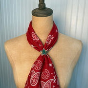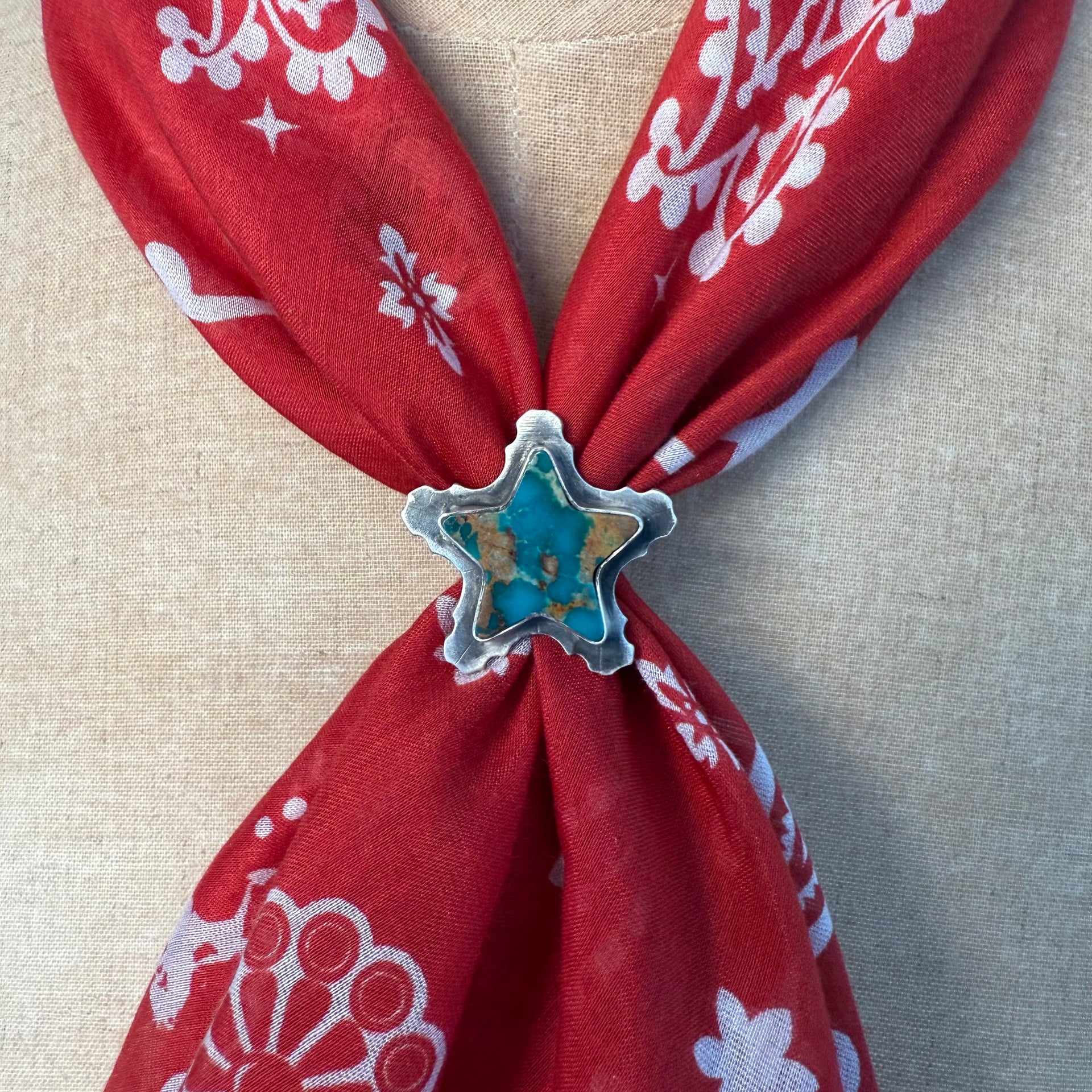 Bring a little western edge to your wild rag with this bold and beautiful Star of the West Slide. Featuring a sterling silver star accented with a striking piece of natural turquoise (each piece will have a slight variation in color). It has an adjustable back to fit any size wild rag or bandana. Each slide is unique made from sterling silver and signed.